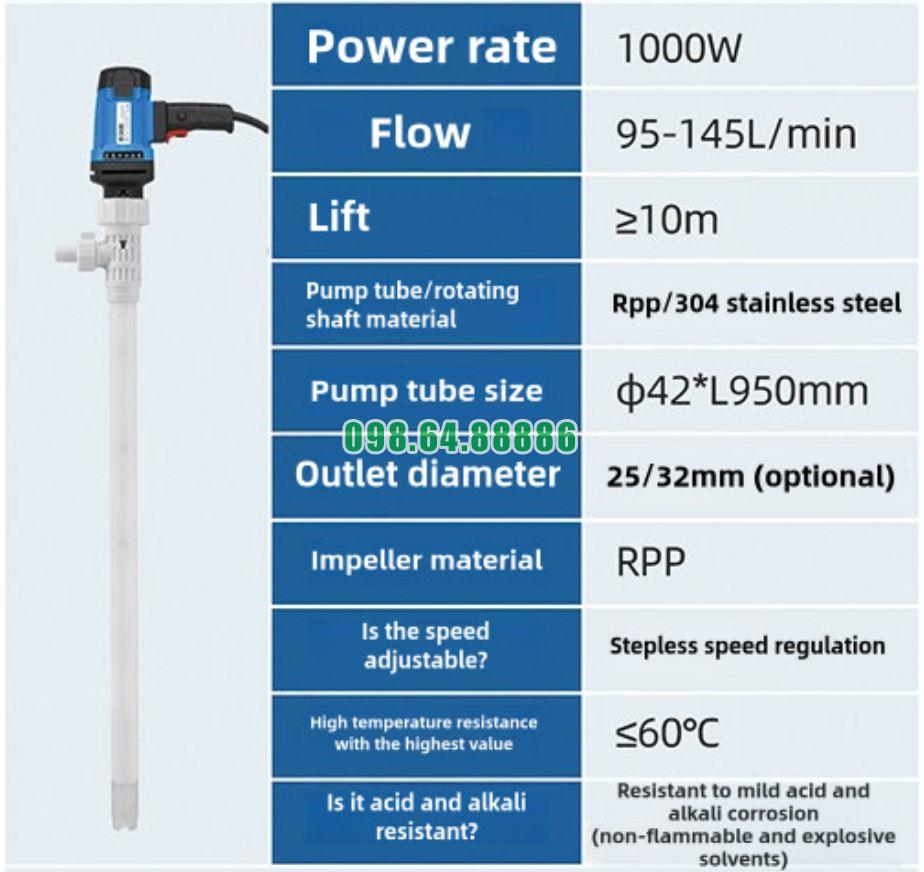 Bơm cắm điện thùng phuy model JDT-1000W-PVDF được đánh giá cao không chỉ về khả năng bơm hóa chất an toàn mà còn ở ưu điểm dễ dàng vệ sinh, đáp ứng tốt yêu cầu khắt khe trong môi trường công nghiệp và hóa chất.