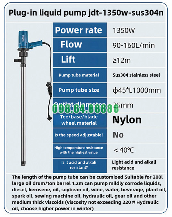 Máy bơm hút thùng phuy cắm điện JDT-1350W-SUS304N rất linh hoạt trong các ứng dụng công nghiệp, bao gồm: