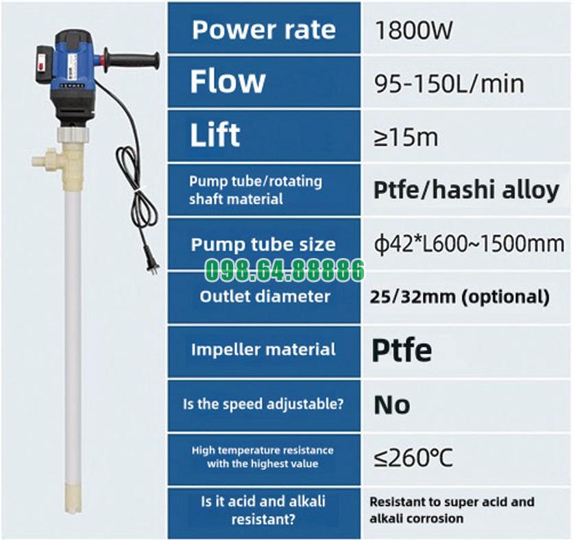 Nhờ cấu trúc trục bơm chắc chắn của Bơm điện thùng phuy 200L JDT-1800W-PTFE, thiết bị có thể: