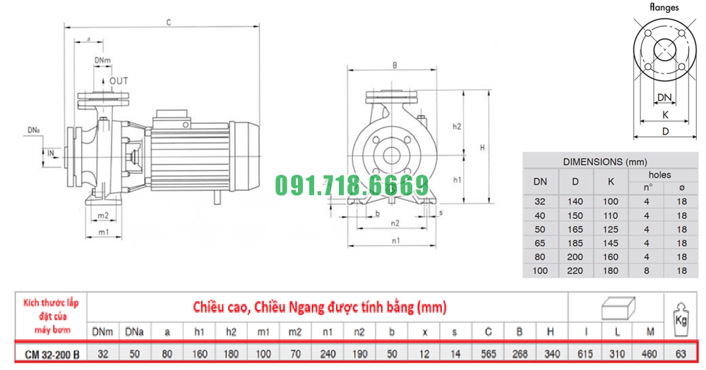 Kích thước bơm nước công nghiệp model CM32-200B