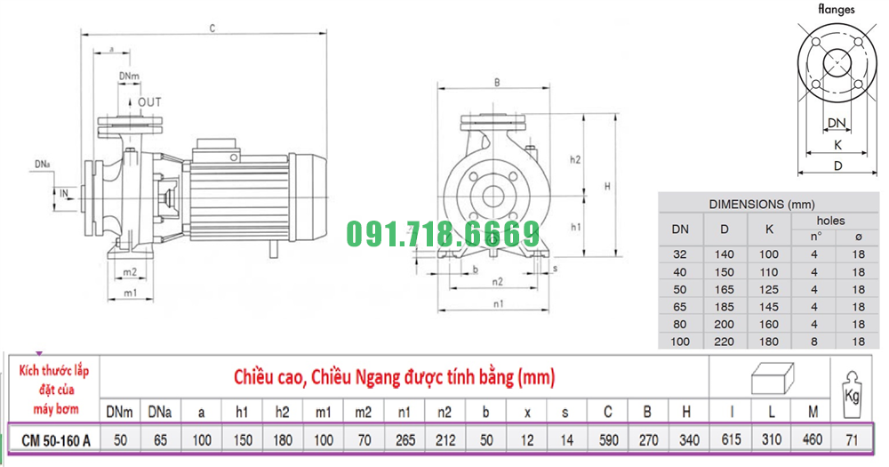 | CM50 - 160A | 78 m3 / h | 37 m | 7.5 kw | 380 v | Dn65 / 40 mm | Vỏ gang FC200 |