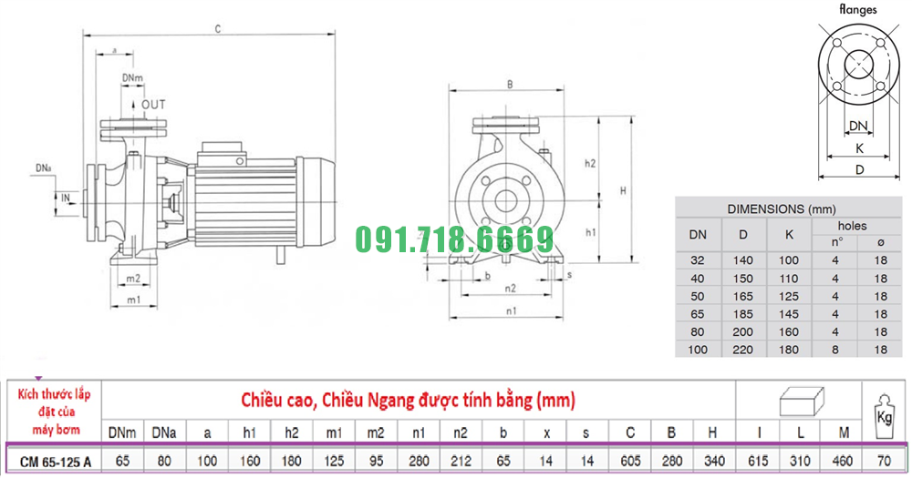 | CM65 - 125A | 132 m3 / h | 24 m | 7.5 kw | 380 v | Dn65 / 40 mm | Vỏ gang FC200 |