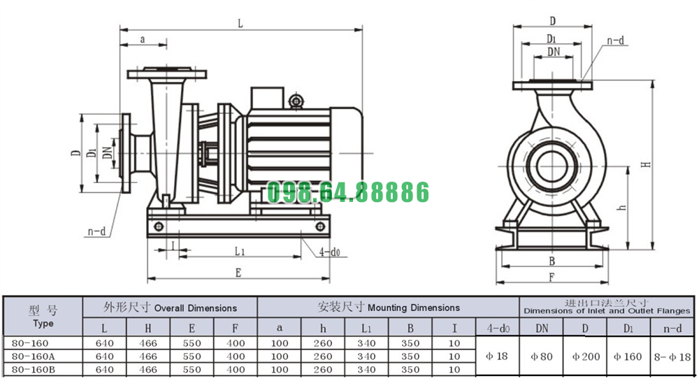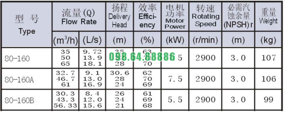 Bảng thông số kỹ thuật bơm nước li tâm trục ngang SLW80-ISW80-160