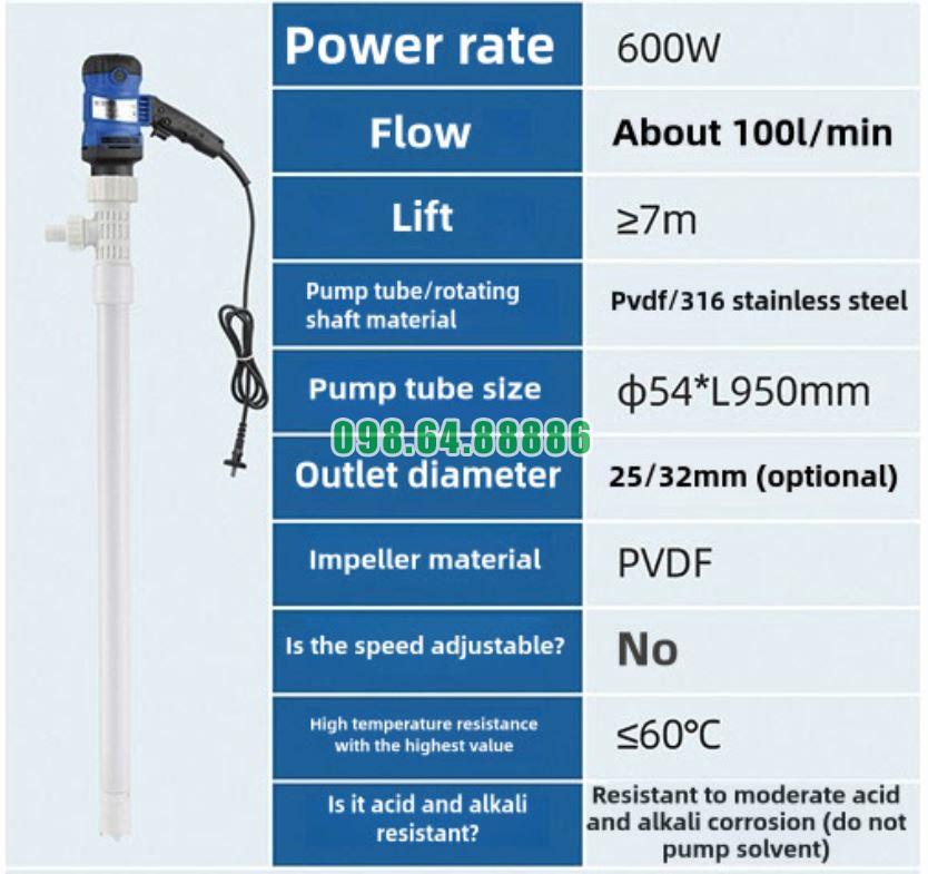 Thông số máy bơm chất lỏng điện cắm nguồn JDT-600W-PVDF