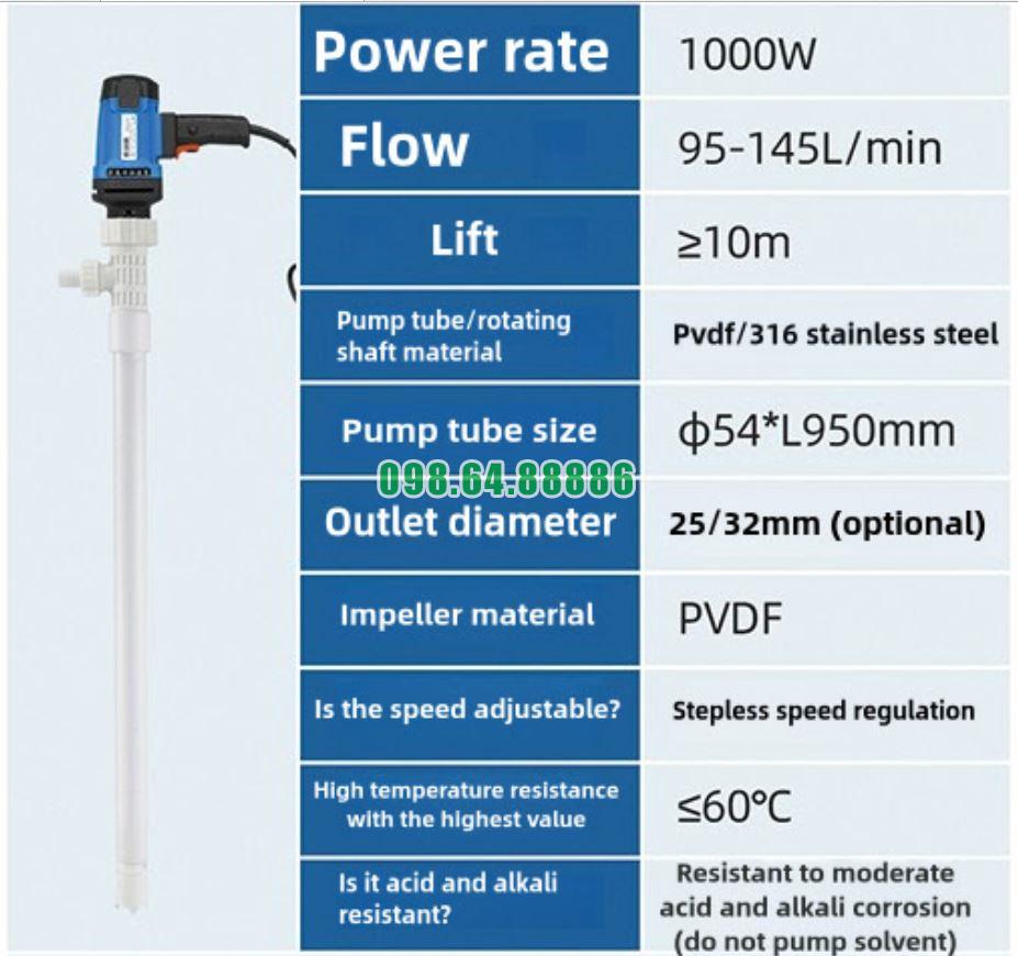 Bơm điện nhúng thùng phuy model JDT-1000W-PVDF