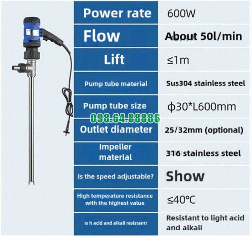 Bơm chiết rót thùng phuy JDT-600W-30SUS304 được sản xuất từ thép không gỉ SUS304, một trong những vật liệu đạt chuẩn quốc tế về độ bền, khả năng chống ăn mòn và tính an toàn khi tiếp xúc với chất lỏng.
