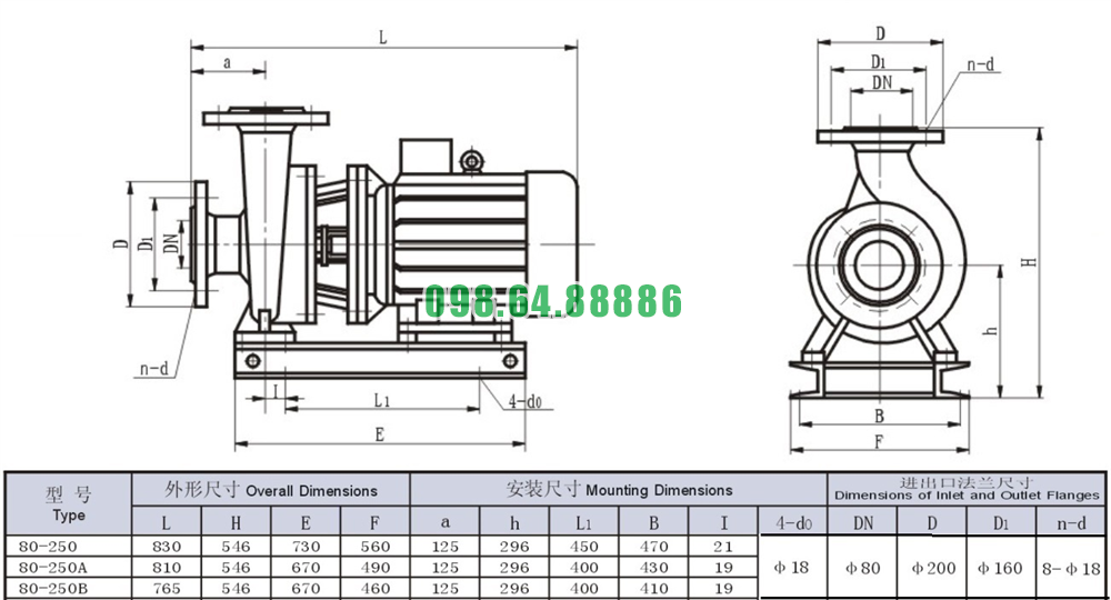 Bảng thông số kỹ thuật bơm li tâm trục ngang mode SLW80-ISW80-250