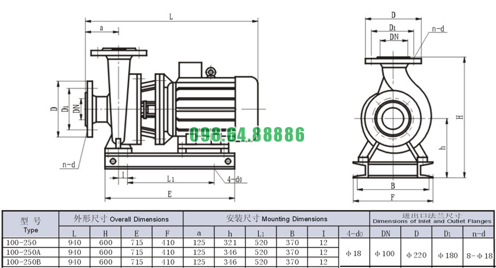 Bản vẽ cấu tạo và kích thước bơm nước li tâm trục ngang hút sâu 4.0m model SLW100-ISW100-250