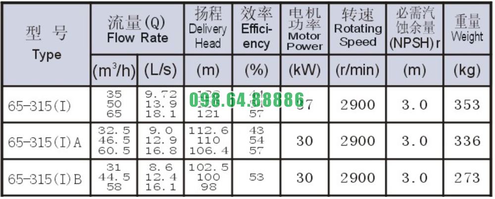 Bảng thông số kỹ thuật bơm nước nằm ngang SLW65-ISW65-315-I công suất 37 kw