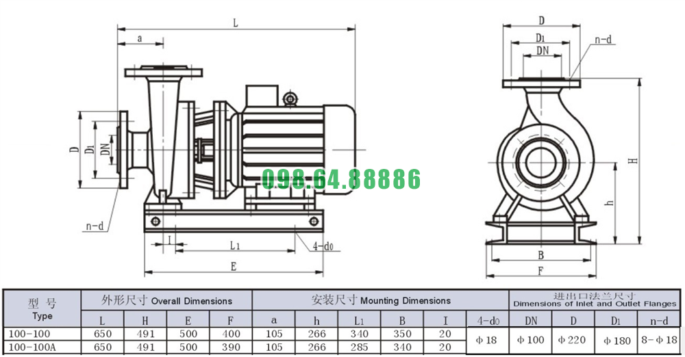 Bản vẽ cấu tạo và kích thước bơm nước trục ngang SLW100-ISW100-100 khối lượng 115 kg