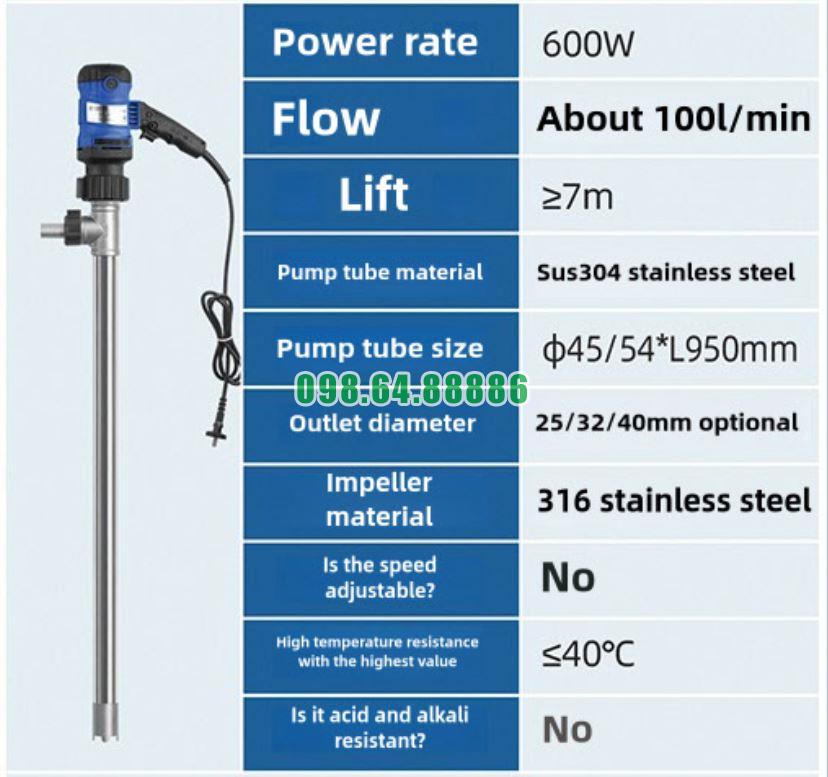 Bơm thùng phuy điện JDT-600W-304SUS không thích hợp cho chất lỏng chứa hạt rắn do cấu tạo cánh bơm ly tâm, đường ống nhỏ, van một chiều nhạy với tạp chất và motor không được thiết kế để xử lý vật cản. Để đạt hiệu quả cao và kéo dài tuổi thọ thiết bị, người dùng nên sử dụng bơm này cho chất lỏng sạch, không lẫn hạt rắn, dầu, dung môi hoặc hóa chất loãng.
