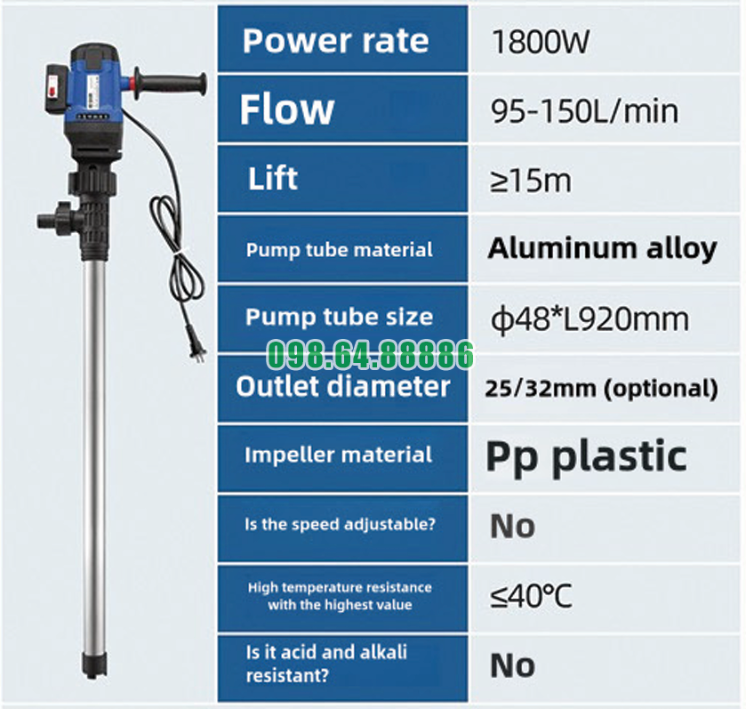 Bơm điện thùng phuy cao cấp JDT-1800W-L92 giúp quá trình chiết rót diễn ra nhanh và liên tục: