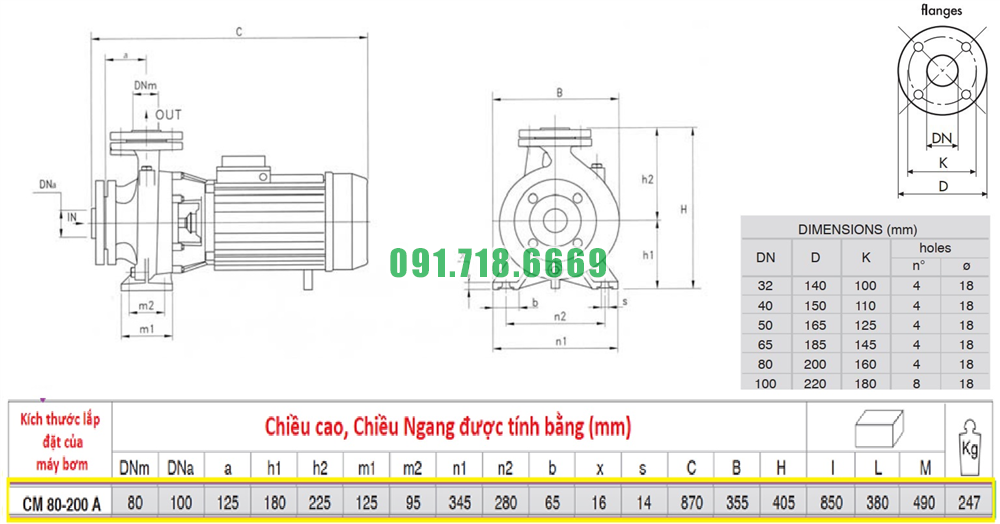 | CM80 - 200A | 240 m3 / h | 60 m | 37 kw | 380 v | Dn 80 / 65 mm | Vỏ gang FC200 |