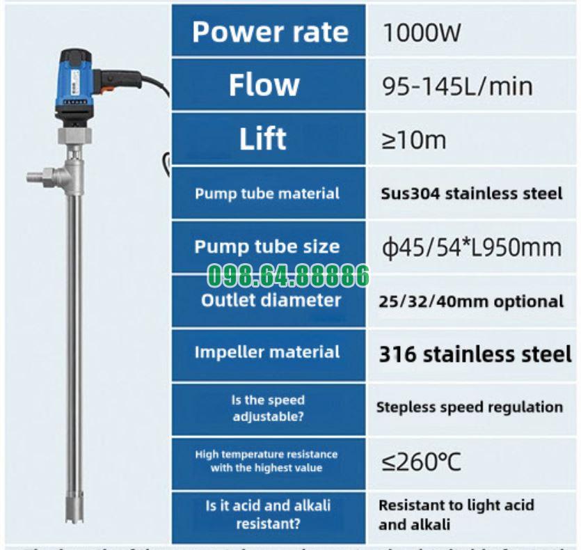 Với động cơ mạnh, lưu lượng ổn định và thiết kế inox chống ăn mòn, máy bơm thùng phuy inox SUS304/316 JDT-1000W-G260 là giải pháp lý tưởng cho các quy trình chiết rót yêu cầu độ chính xác cao. Thiết bị giúp tiết kiệm thời gian, giảm hao hụt và đảm bảo chất lượng sản phẩm, đặc biệt trong ngành hóa chất, sơn, dược phẩm và thực phẩm công nghiệp.